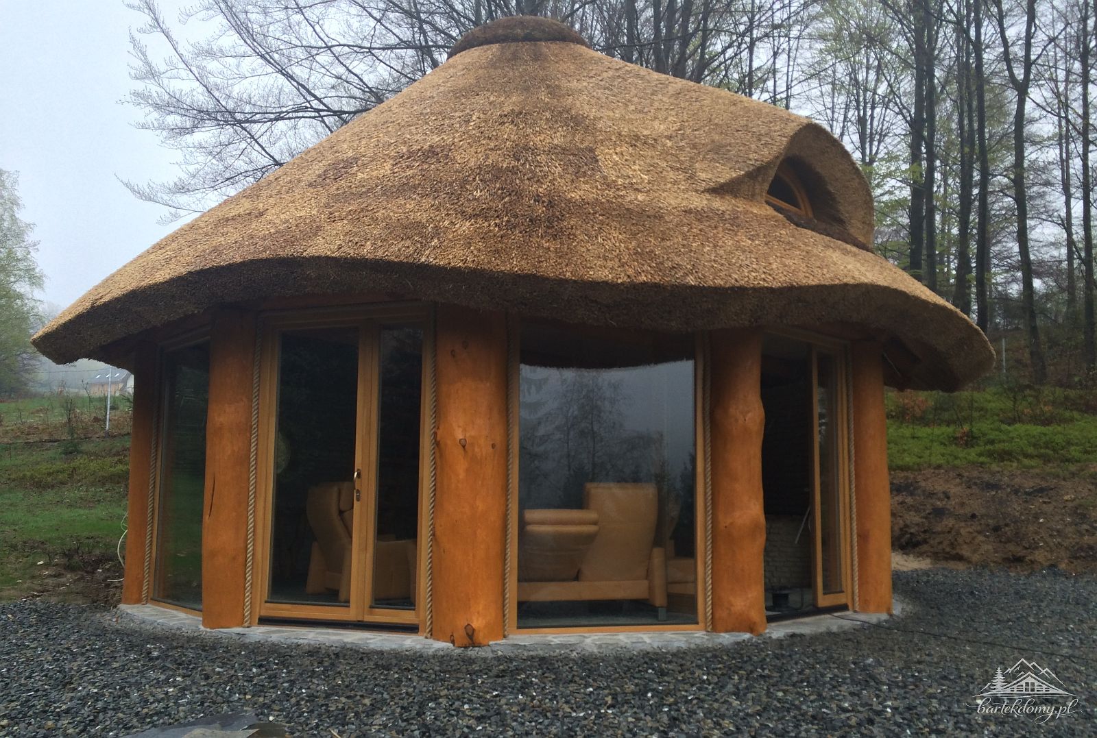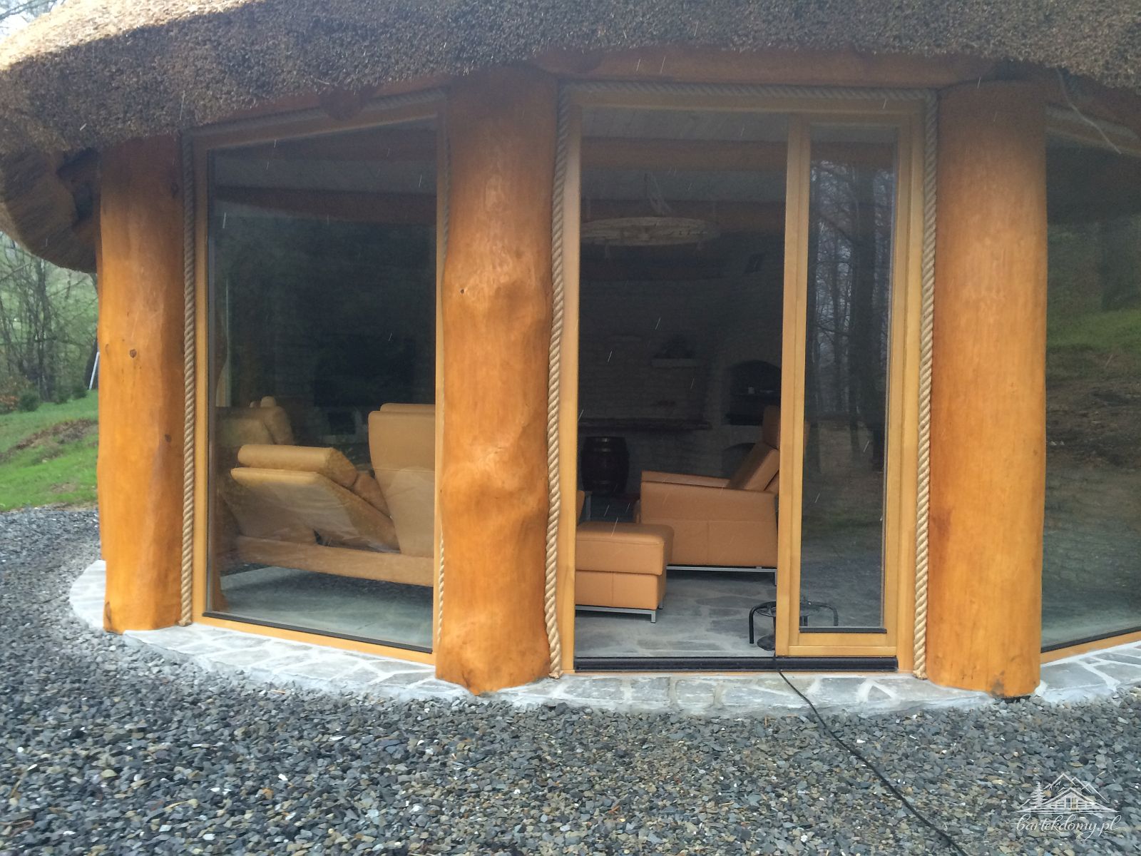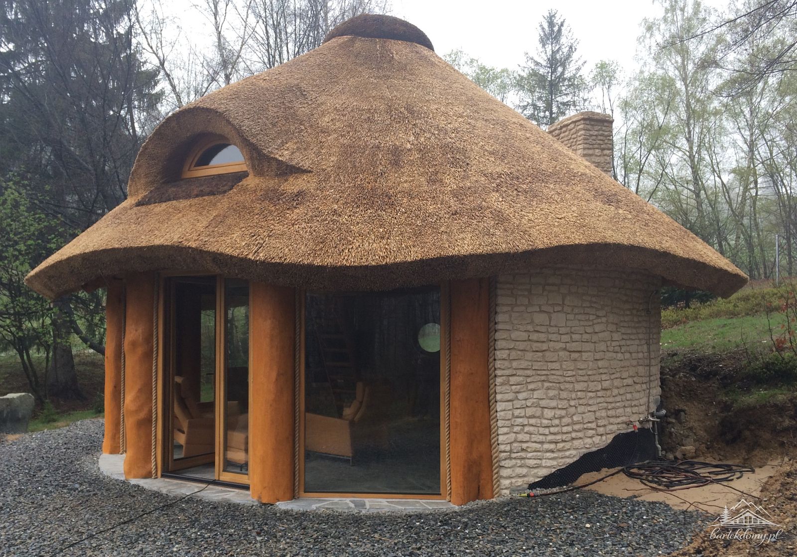 Słupy nośne altany o śr.50cm, w dachu krytym strzechą 1 nieotwierane wole okno.