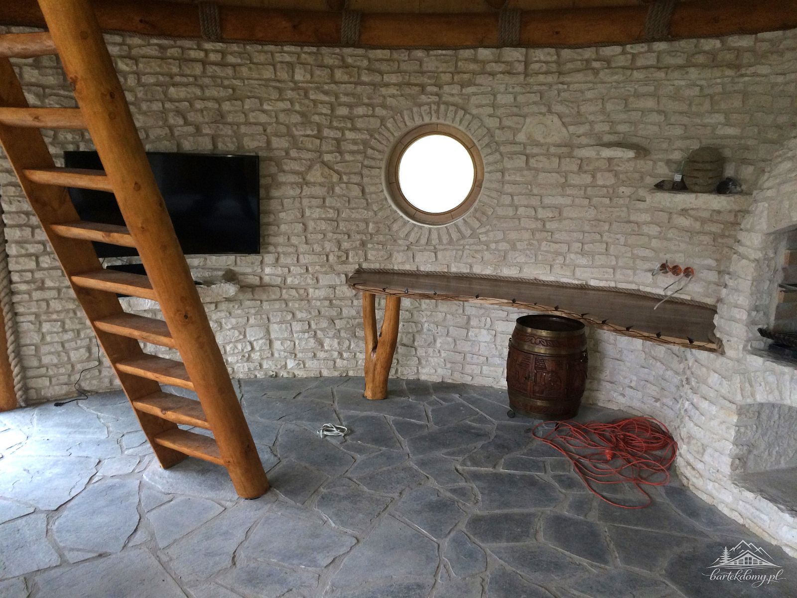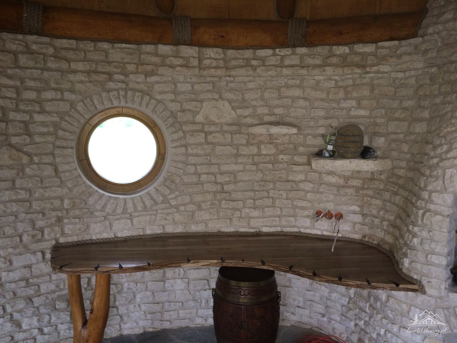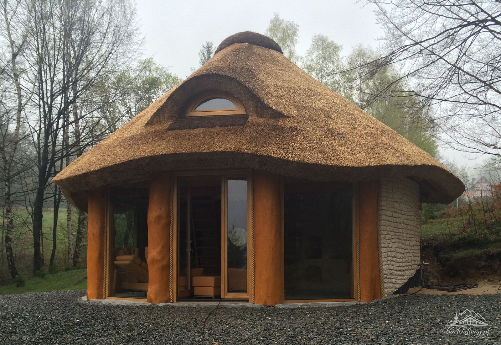Słupy nośne altany o śr.50cm, w dachu krytym strzechą 1 nieotwierane wole okno.