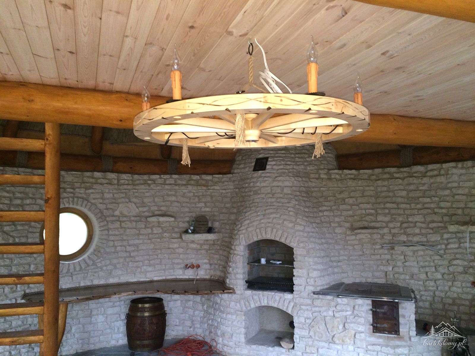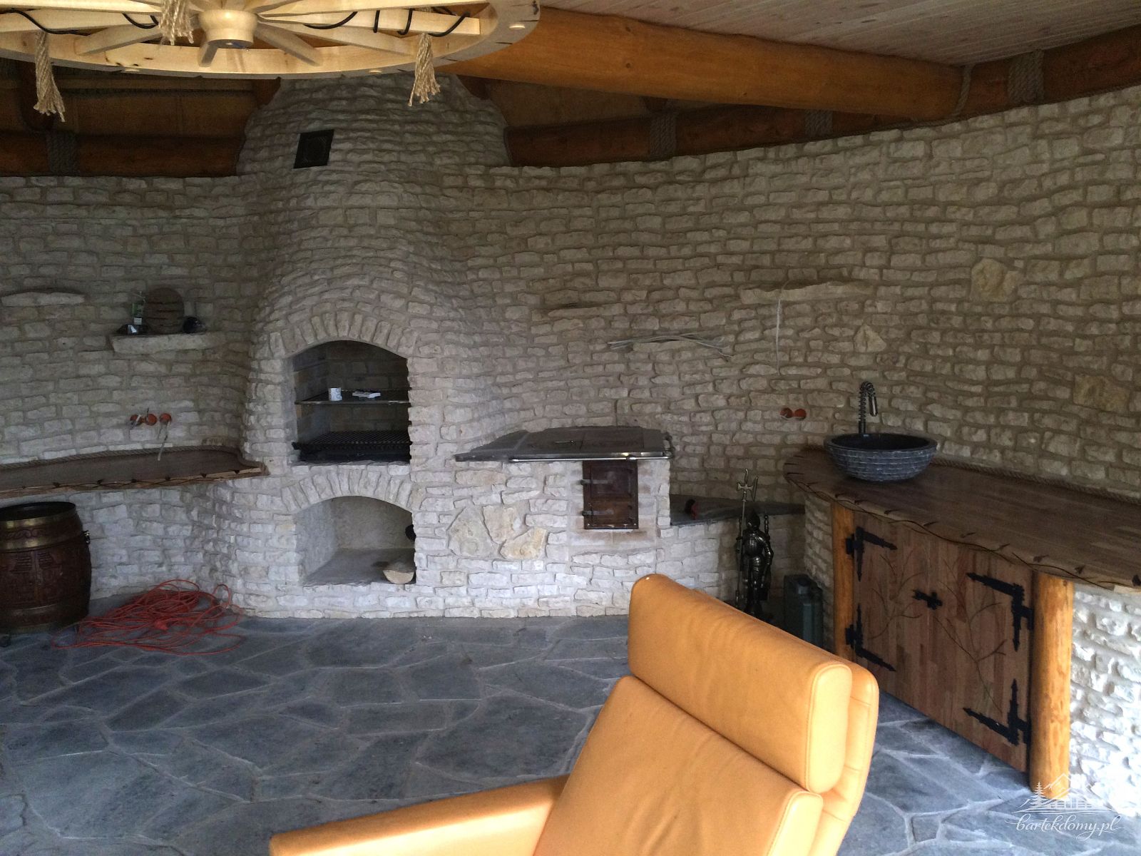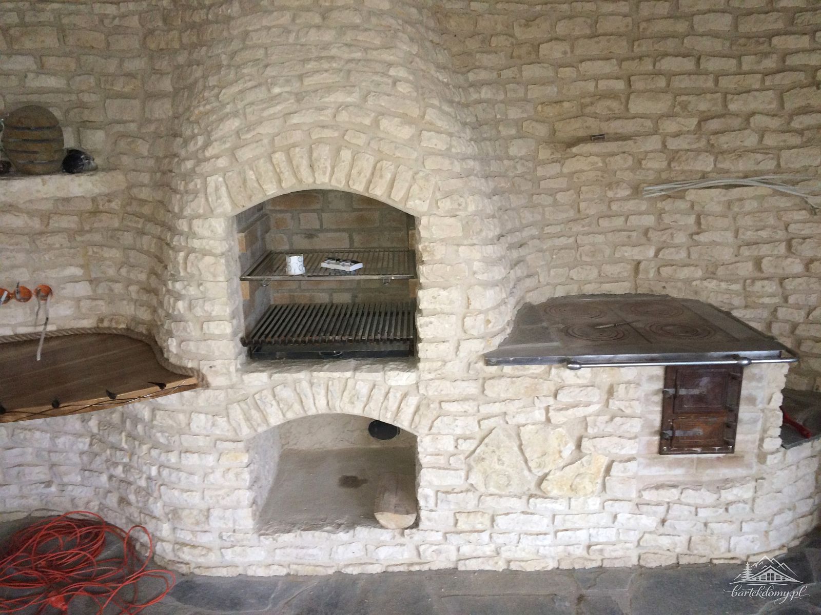 W altanie miejsce na kominek z grillem, piec kuchenny tzw. kuchnia fajerka- 2 stanowiska, blaty dębowe, mury z piaskowca jasnego, antresola, stolarka okienna PCV 2 szybowa, rozprowadzenie instalacji elektrycznej( materiały kupuje Inwestor).