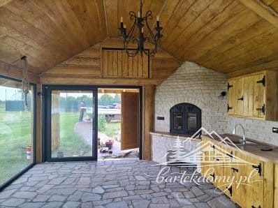 Altana biesiadna, kryta strzechą o wymiarze zewnętrznym po obrysie słupów nośnych 7mx5m z wc, altana kryta blachodachówką gont Janosik + orynnowanie PCV, dach 4 spadowy o kącie nachylenia miedzy 35-45 stopni, docieplony wełną 15 cm grubości + membrana+ krokwie 16×8 + łaty + kontrłaty, od środka deska na oflis o gr. 2cm, słupy nośne o śr. ok. 35cm, ściany kamienne z muraka jasnego- piaskowiec (kolor jasny), ściany WC z imitacji drewnianej pół bala z 2 stron + docieplenie wełna 10cm + drzwi drewniane, 3 przeszklenia 3 szybowe stałe, 2 przeszklenia 3 szybowe na Hs-kolorystyka stolarki do ustalenia przed zamówienie stolarki okiennej.