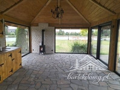 Połączenie drewna, kamienia naturalnego oraz solidnej płyty fundamentowej zapewnia trwałość budynku na wiele lat. Konstrukcja jest odporna na warunki atmosferyczne i intensywne użytkowanie.