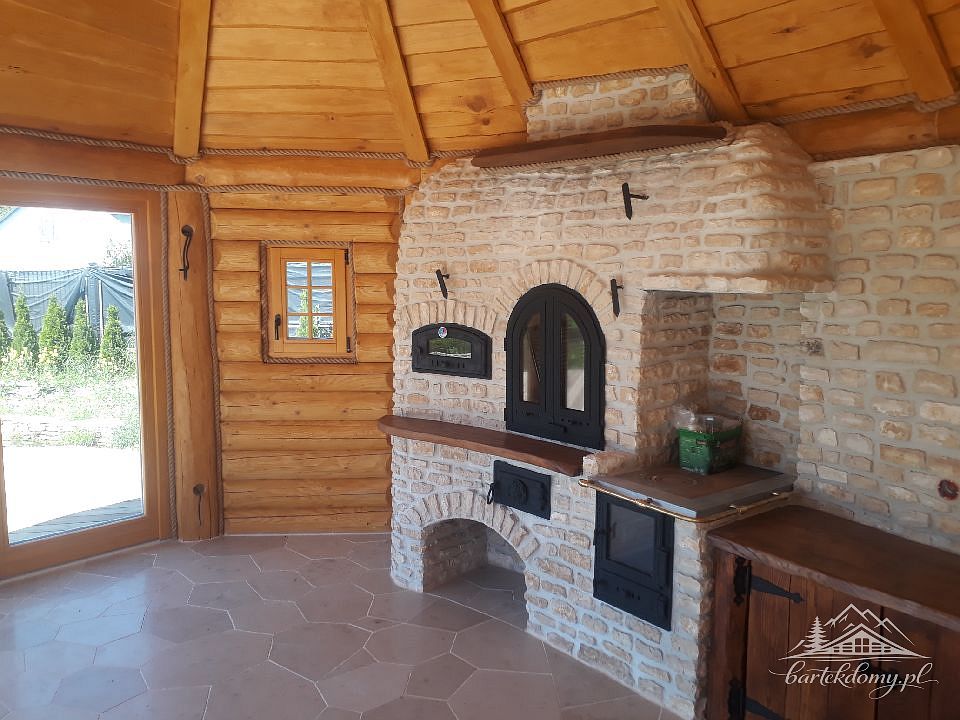 Wyposażenie altany krytej strzechą: kuchnia fajerka, grill z drzwiczkami, piec chlebowy, blat roboczy, szafki.